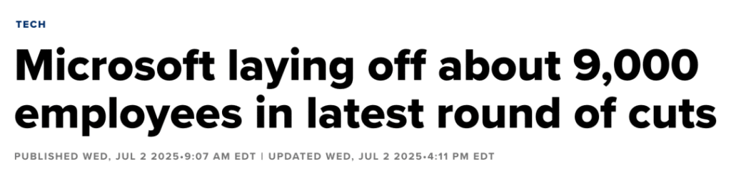 微软近期宣布:将裁员约9,000人,约占微软总员工人数的4%,这已经是今年之内微软的第二轮大型裁员了!是这家科技巨头自2023年裁员1万人以来规模最大的一次裁员,今年5月微软刚刚进行了一轮约7,000人的裁员,裁掉了微软总员工人数约3%。