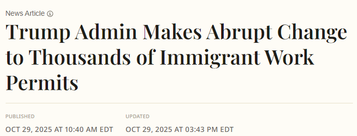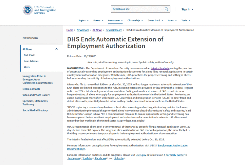 10月29日,美国国土安全部突然宣布:从2025年10月30日起,正式取消EAD工卡续签的540天自动延期政策!