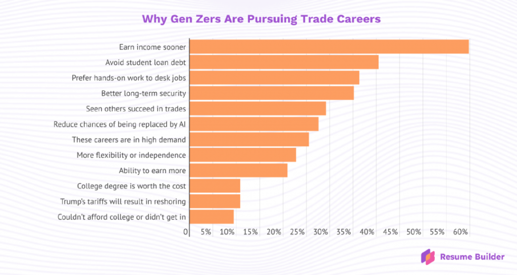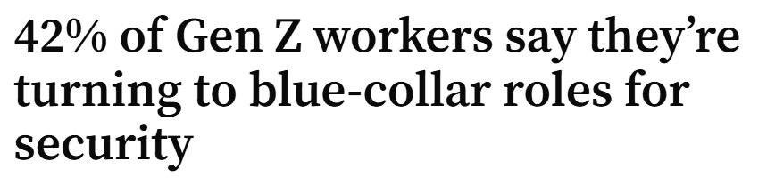 一份来自美国求职平台 Resume Builder 的最新调查显示:超过四成的 Z 世代大学毕业生,正在主动选择进入蓝领行业——他们放下学位证书,走进工厂、工地、维修站,或是投身餐饮、物流、技工类岗位。