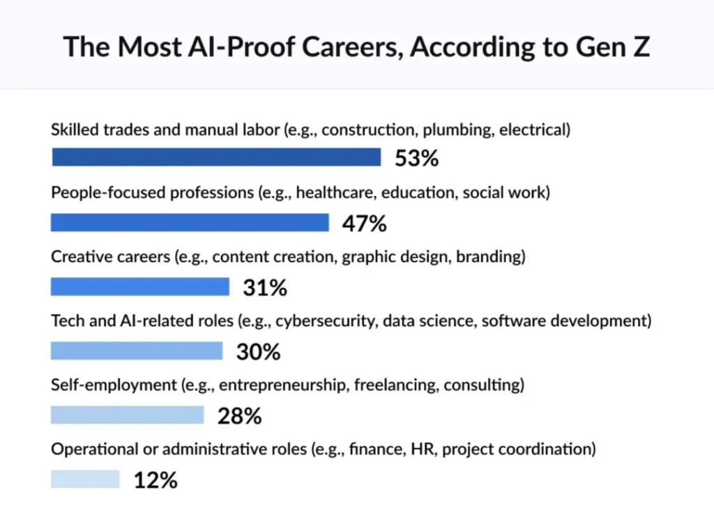 数据分析、内容生成、基础行政等白领岗位,正逐渐被自动化工具替代。而维修、护理、建筑等技术性体力工作,反而因“难以被机器取代”而更具稳定性。