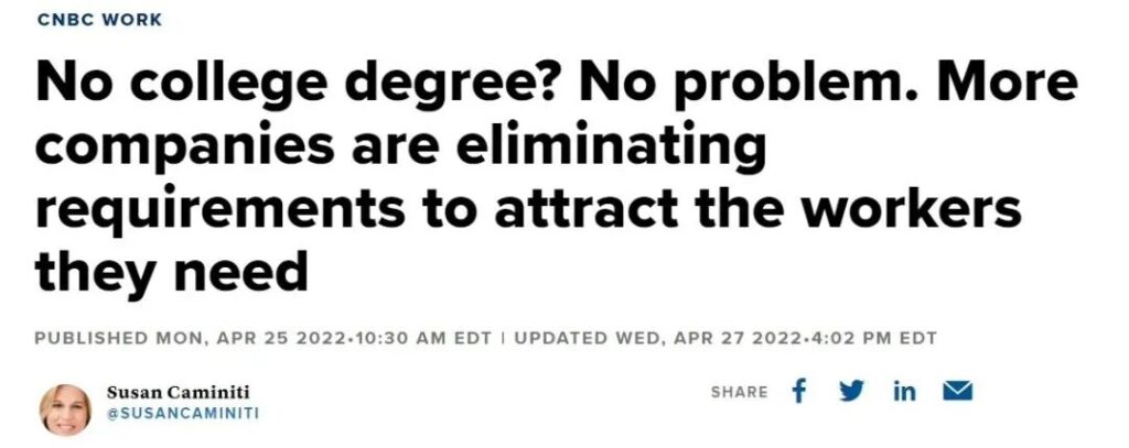 据Burning Glass Institute的报告显示,在2017年到2019年期间,企业约减少了46%中等技能岗位以及31%高等技能岗位的学历限制,特别是在金融、工程、企业管理、医疗保健行业内尤为突出,其中不乏一些大家耳熟能详的名企。