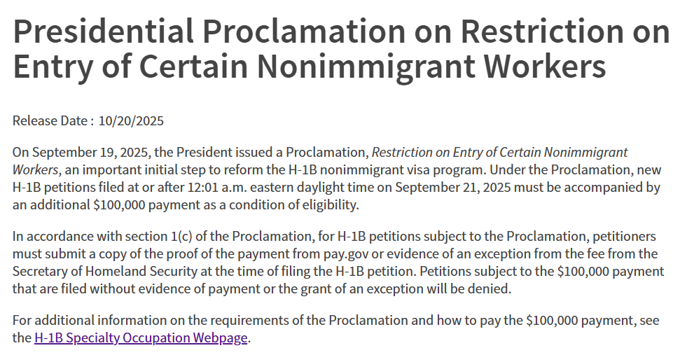 👉在2025年9月21日及之后提交的新申请,且受益人不在美国境内,也未持有有效的H-1B签证。