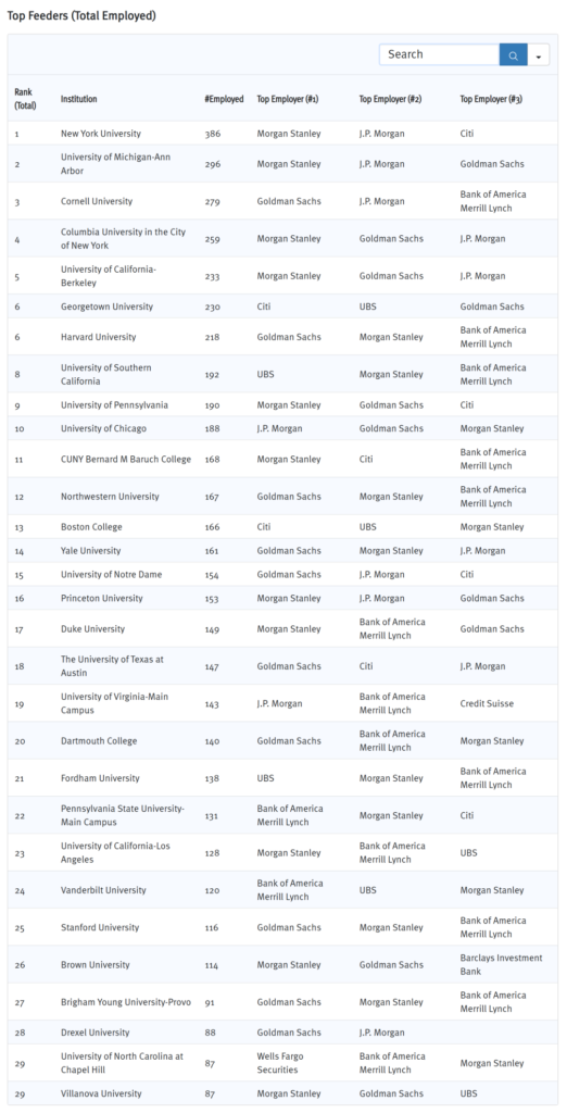 这份榜单回答了一个直接的问题:哪所学校的校友在投行中人数最多?