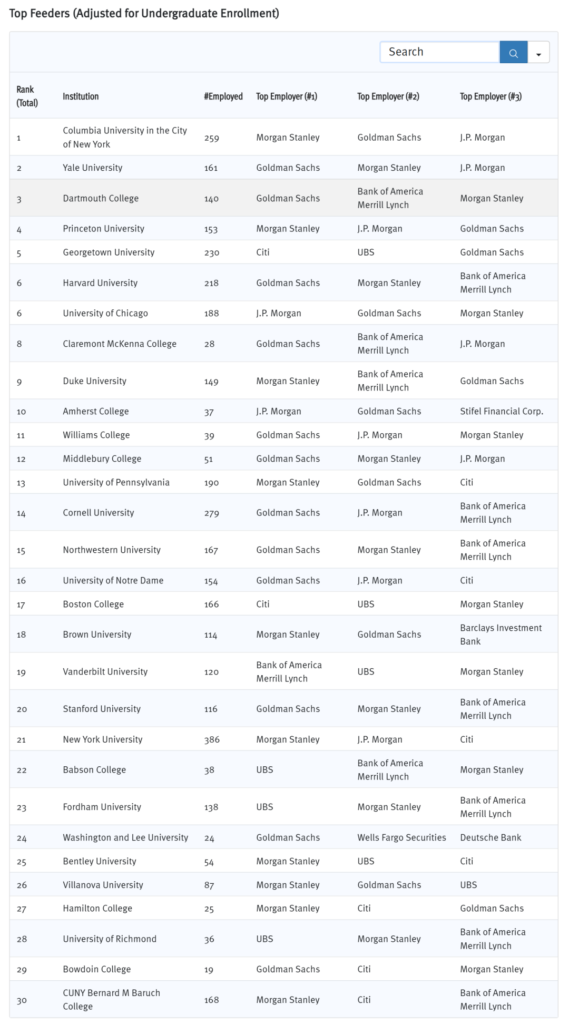 在这份榜单中,一些“小而精”的学校脱颖而出,例如达特茅斯学院、乔治城大学,以及部分文理学院如威廉姆斯学院。尤其是威廉姆斯学院,虽未设商学院,却有高达22.87% 的毕业生进入投行,被誉为“华尔街的西点军校”。
