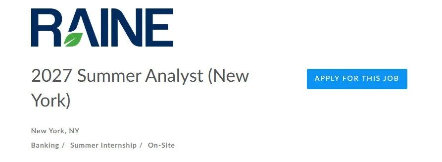 Raine开放2027 Summer Analyst项目,为期10周,面向毕业时间在2027年12月-2028年5月/6月,目前大二在读的学生们。