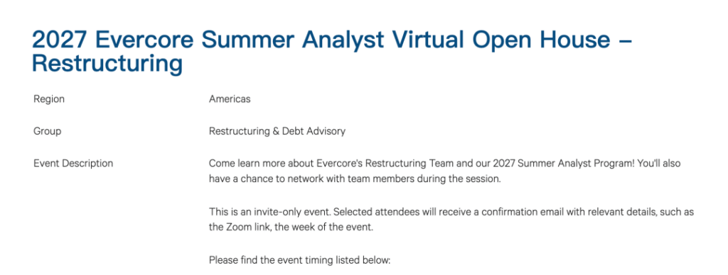 精品投行Evercore已开放2027 Summer Analyst Virtual Open House,这个活动主要是让目前大二的同学们提前了解Evercore 2027 Summer申请,如果大家感兴趣,可以在11月13日前递交申请。