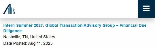 被誉为是“最赚钱”的咨询公司A&M开放岗位:Global Transaction Advisory Group – Financial Due Diligence /Corporate Performance Improvement 2027 Summer Intern