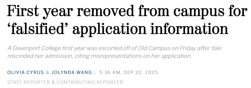 近日,留学圈被一则新闻刷屏:耶鲁大学达文波特学院的一年级新生Katherina Lynn,在入学仅一个多月后,因申请材料造假被校方撤销录取并开除。美东时间9月22日,她在耶鲁校警和院长Anjelica Gonzalez的陪同下被带离Lanman-Wright Hall宿舍楼。