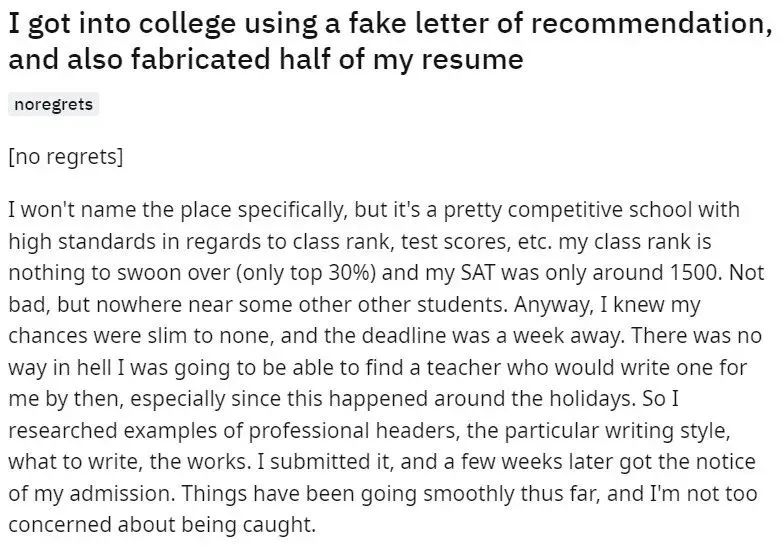 千万别以为招生官无暇核实,College Confidential论坛有学生分享,她做志愿者的图书馆接到了招生官的核实电话。在Reddit上,甚至有学生自曝因找不到老师,在假期仿写教授推荐信并提交。